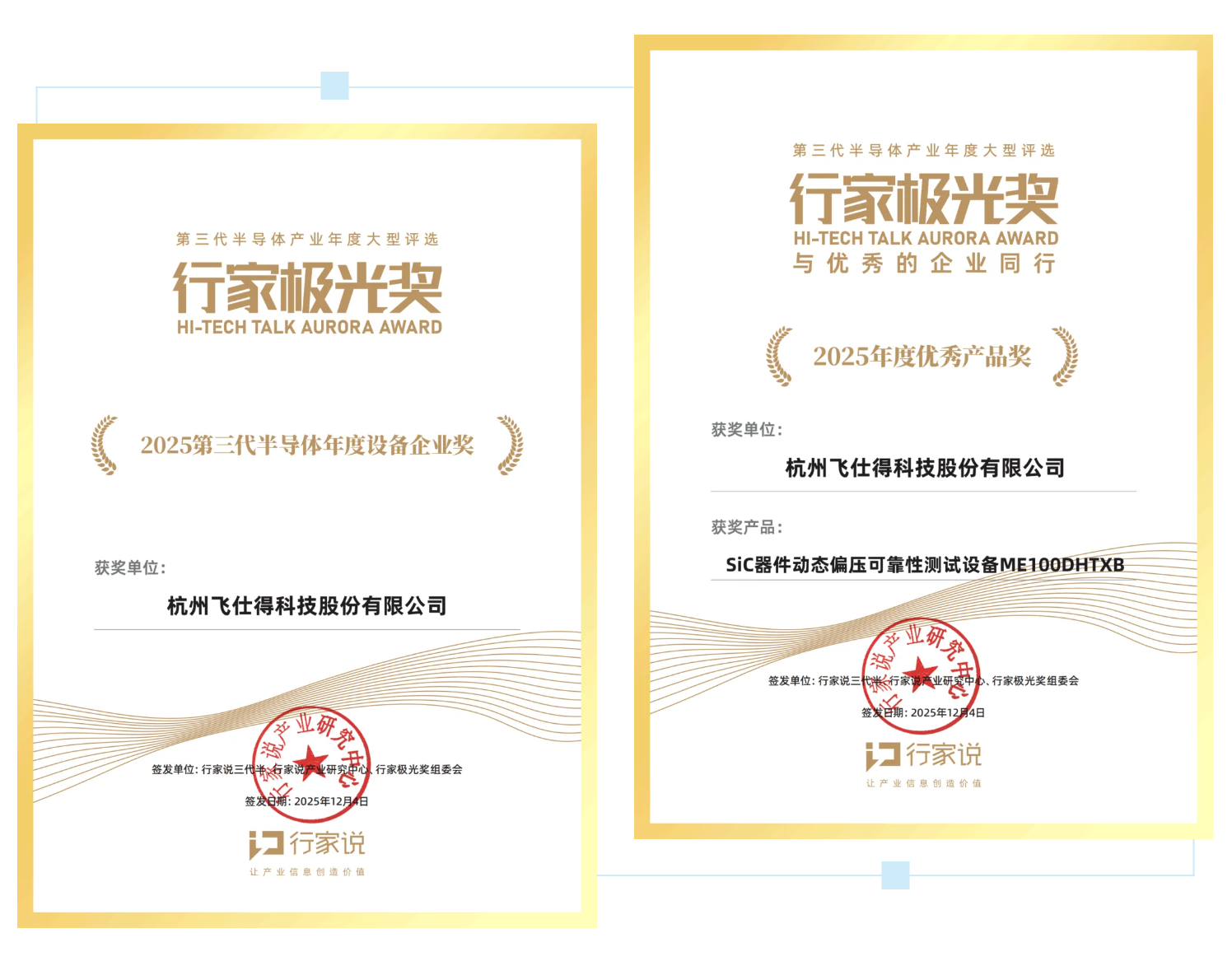 12月4日,在第三代半导体产业权威平台“行家说”主办的2025行家说极光奖 评选中,飞仕得科技一举斩获 “2025第三代半导体年度设备企业奖” 与 “2025年度优秀产品奖” 两项大奖。