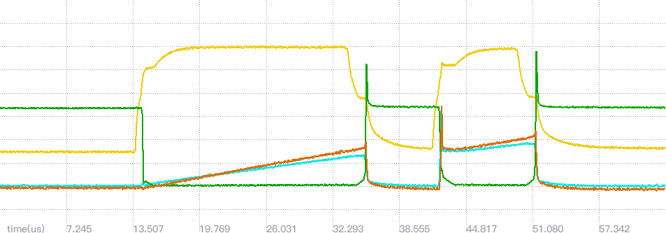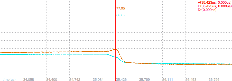 ②在测试动态均流时,使用双脉冲测试方法,温度变高后,动态均流的性能也会变好