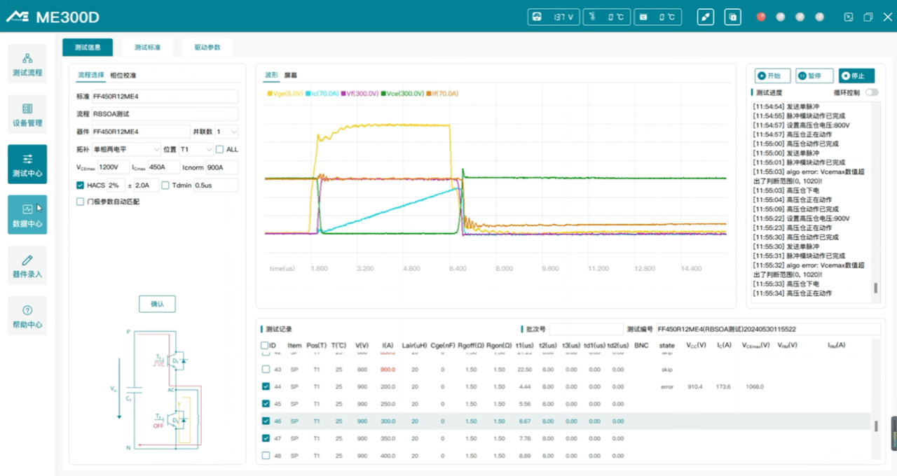 本次介绍的功率半导体器件RBSOA测试案例,基于Firstack的SiC MOSFET动态测试设备ME300D、英飞凌模块FF450R12ME4、通用测试驱动V1.2、EconoDUAL™3驱动板、低感母排电容池搭建完成。