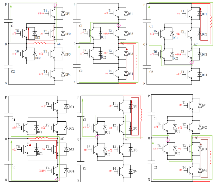 三电平拓扑的核心思想是在传统的两电平基础上增加一个中点,从而在开关器件上产生三个输出电压电平。这种设计使得器件的耐压要求仅为直流母线电压的一半,降低了对单个器件的电压等级要求。通过控制桥臂上不同开关器件的导通组合,输出端可以连接到直流母线正电平Vp、负电平Vn或中性点O。通过切换不同开关输出+VDC/2、-VDC/2和0电平。这种结构通过钳位二极管确保上下桥臂器件的电压应力均被钳位在VDC/2。