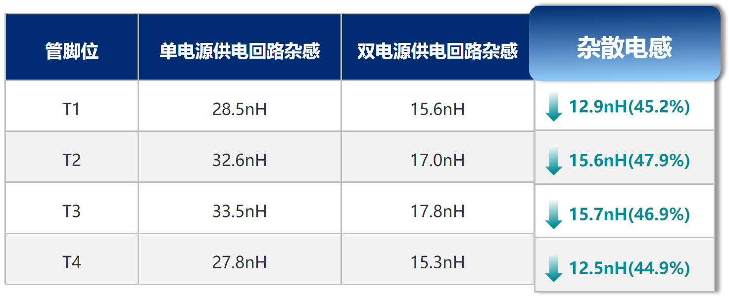 下表1为双电源供电系统实测回路杂感(不包含器件本身)与单电源供电系统对比。